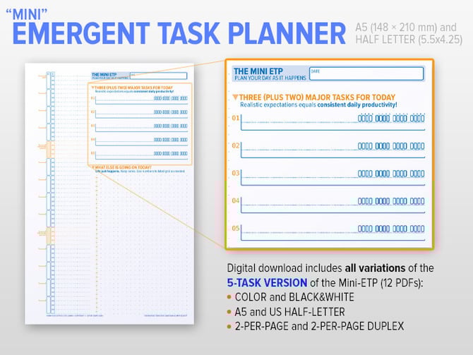 This is a half-size (A5 and 4.25x5.5") package of a 5-task + time tracking Emergent Task Planner (ETP) design.