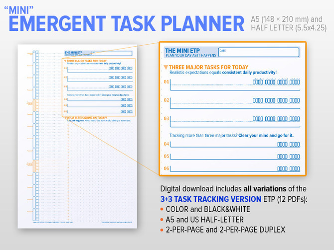This is a half-size(A5 and 4.25x5.5") package of a 3 Main Task + 3 Emergent Task Planner (ETP) design. If you are doing time tracking on a few main projects a day, this split design might be for you.