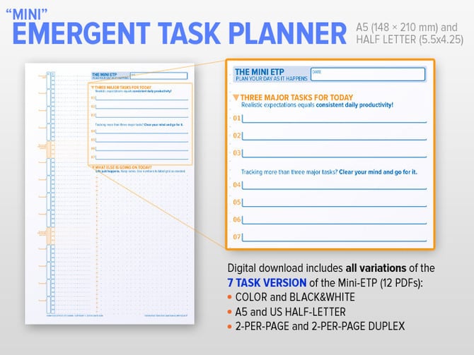 This is a half-size(A5 and 4.25x5.5") package of a 7-task Emergent Task Planner (ETP) design.
